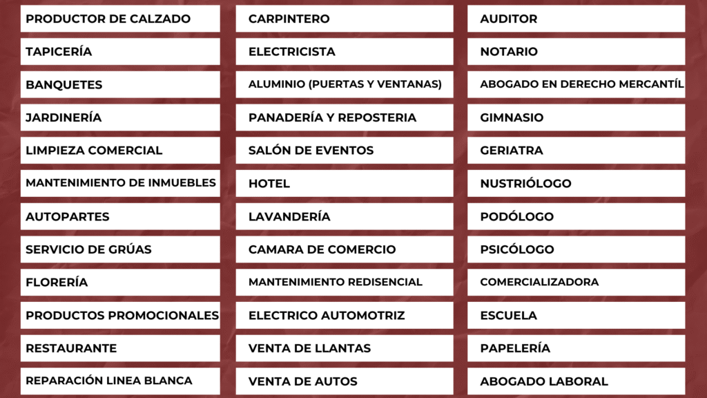 Nuestro capitulo cuenta con 55 Networkers al día de hoy y buscamos incrementar el número por medio de especialidades, por ello te dejamos la lista de giros disponibles en nuestro GET.